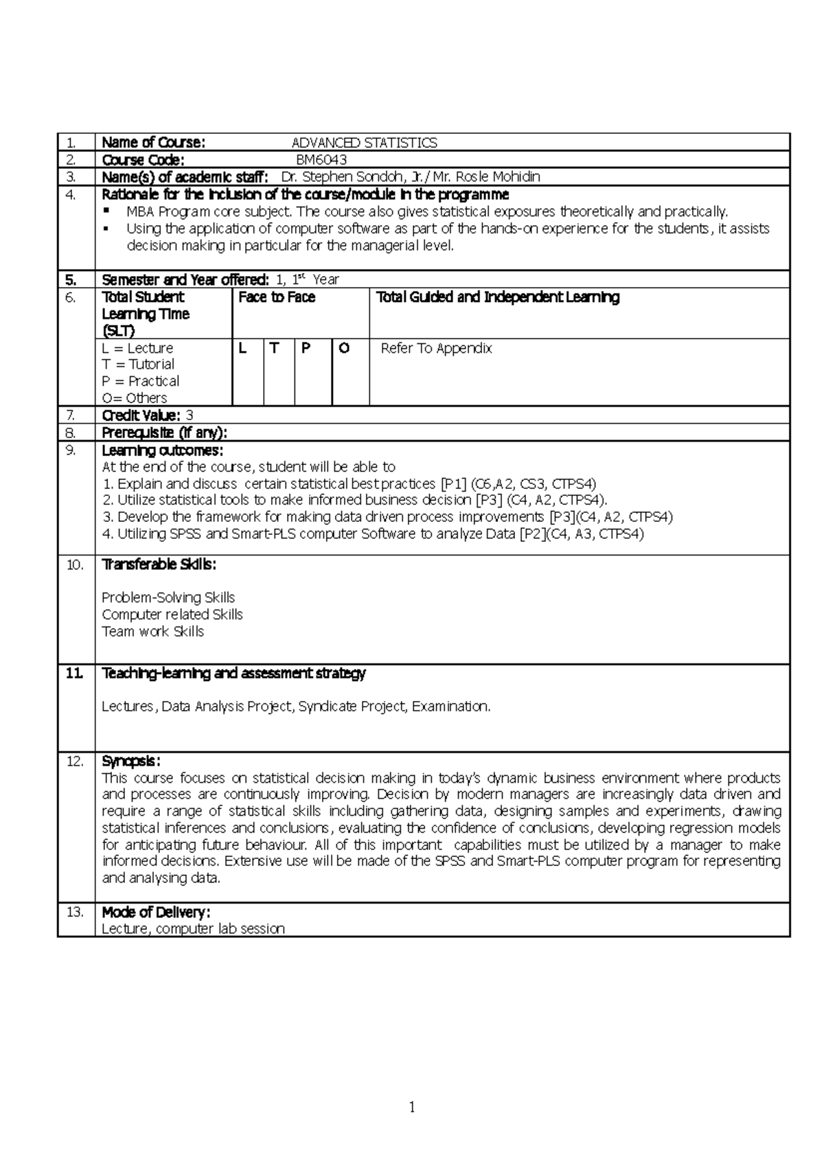 Bm6043 Advance Stat Name Of Course Advanced Statistics Course Code Bm Name S Of Academic Studocu