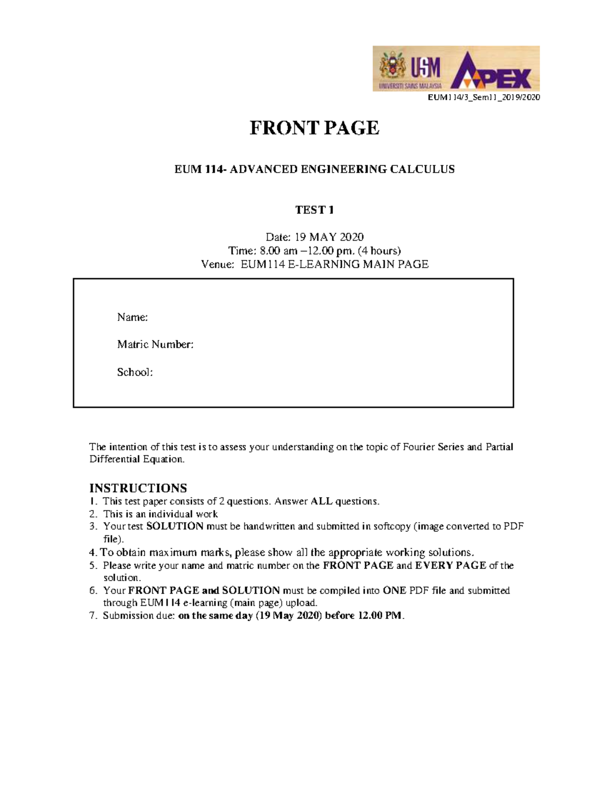 Test 1 Eum114 3 Sem 11 2019 Front Page Eum 114 Advanced Engineering Calculus Test 1 Date 19 Studocu